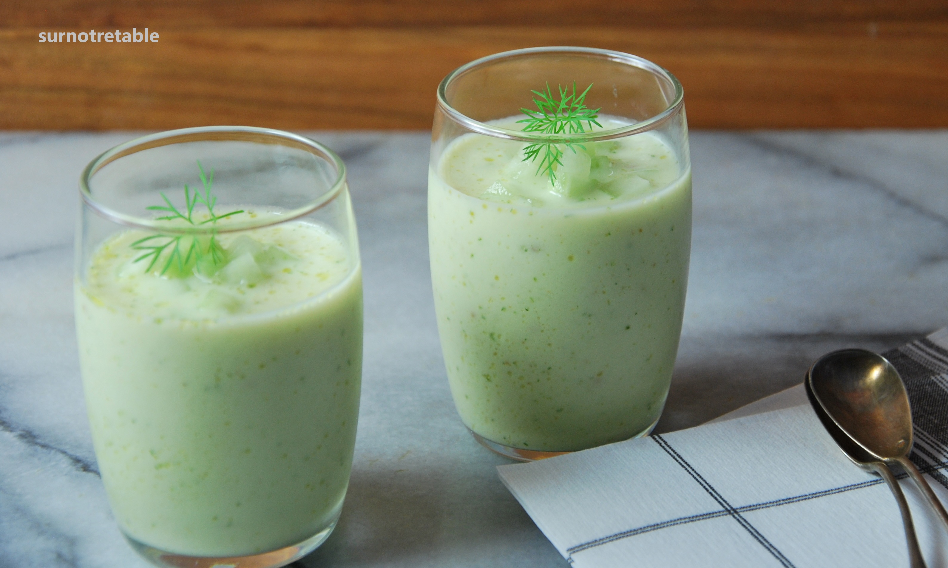 4. Once the flavours of the cucumber and the other ingredients have combined you can pour into a blender and purée until smooth.  Then slowly add the vegetable stock and continue to purée until it is fully blended, for about 30 seconds.